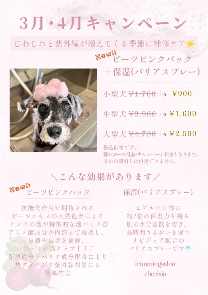 3月・4月限定キャンペーン🌸 お知らせ ちぇりしあ たつの市トリミングサロン ブログ 2026.03.02 じわじわと紫外線が増えてくる季節にピッタリの保湿ケア✨️ Newスパメニューのビーツピンクパック🌷🫧 ➕ 保湿スプレー🚿 紫外線や花粉、アレルギーが発症しやすい時期に保湿スプレーでバリア✨️ ビーツピンクパックは紫外線対策におすすめです👍⭐️ 通常よりお気軽にお試しいただけるため、気になる方は是非お声かけください😉